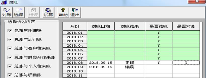 2.如果期初平衡,进入总账—期末—对账,逐个月份检查对账情况